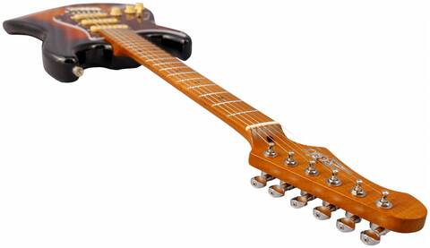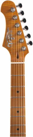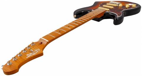 Гриф и накладка на гриф выполнены из печеного клена (roasted maple). При такой обработке поры дерева максимально сжимаются и в процессе использования вода уже не будет выходить, ваша накладка не сожмется и лады не повылазят вне зависимости от влажности и смены температуры. Плюс такое дерево выглядит очень красиво.