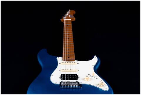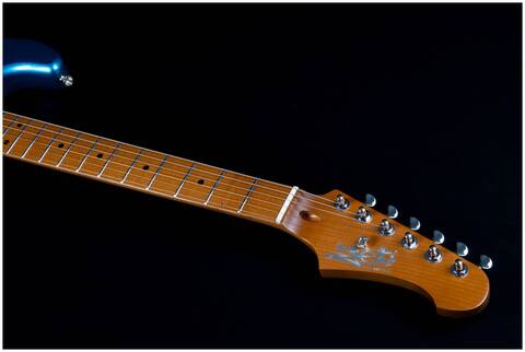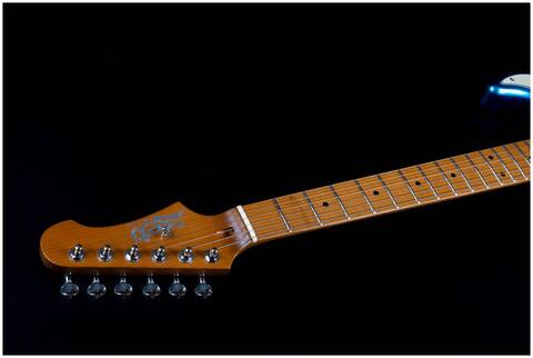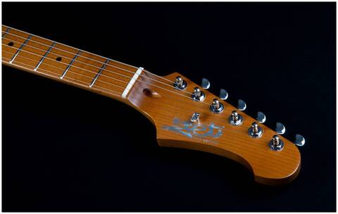 Гриф и накладка на гриф выполнены из печеного клена (roasted maple). При такой обработке поры дерева максимально сжимаются и в процессе использования вода уже не будет выходить, ваша накладка не сожмется и лады не повылазят вне зависимости от влажности и смены температуры. Плюс такое дерево выглядит очень красиво.