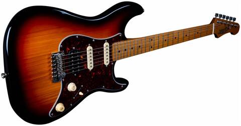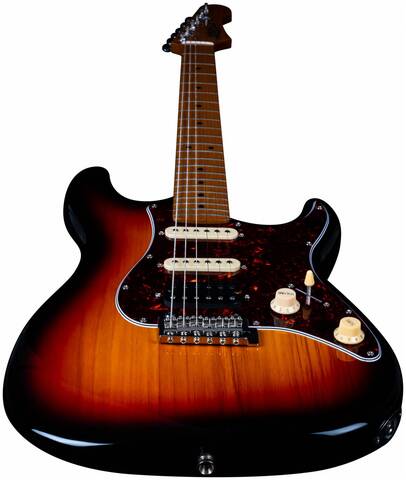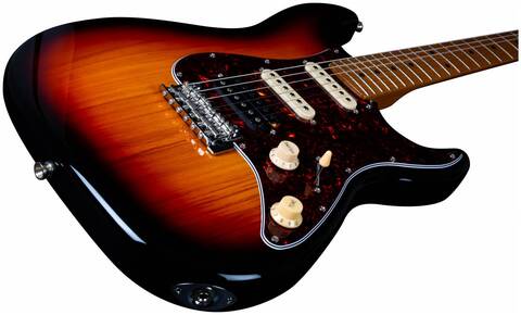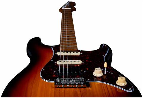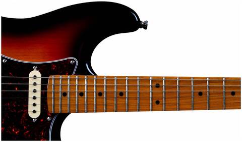 Гриф и накладка на гриф выполнены из печеного клена (roasted maple). При такой обработке поры дерева максимально сжимаются и в процессе использования вода уже не будет выходить, ваша накладка не сожмется и лады не повылазят вне зависимости от влажности и смены температуры. Плюс такое дерево выглядит очень красиво.
